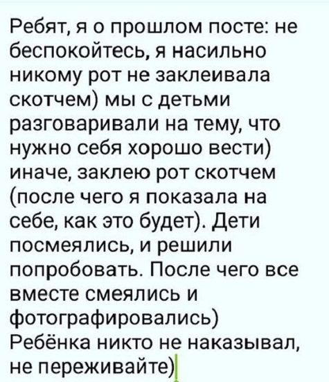 Известно, что первый пост с фотографией ребенка был удален воспитательницей. Сразу после этого она написала сообщение в группе «Подслушано Ангарск», где заявила, что просто в игровой форме объясняла детям, что нужно вести себя хорошо. По версии уволенной воспитательницы, сначала она заклеила рот себе, чтобы показать детям, какое их ждет наказание в случае плохого поведения, после чего дети, балуясь, тоже заклеили рты себе и сфотографировались так.